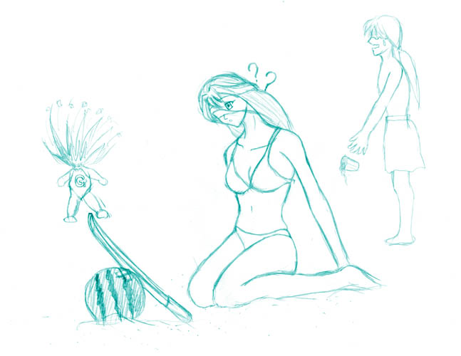 夏だったんで、水着ばかり描いてもらいました。 リューセ、シェオール、ガンバです。 見所は、なんといっても貴重な男性キャライラスト、 シェオールでしょう(笑)。
