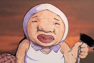 ほっかむりをした──ころころ太った──顔の大きな──肩にカラスを乗せた──男が、手際よくモヤシを炒めている。
